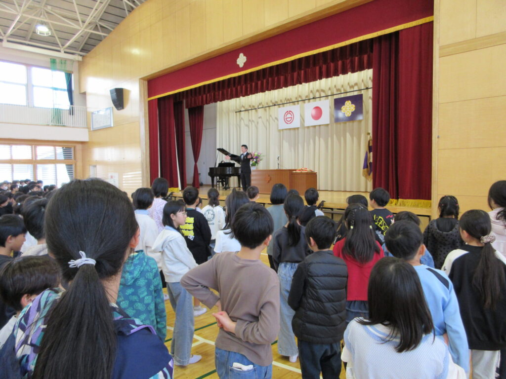 始業式では、6年生が最高学年として立派な返事の手本を見せてくれました。また、国から給与される教科書を各学年の代表者が校長先生よりいただきました。「勉強をがんばるぞ」という気持ちが伝わってきました。久しぶりの校歌も上手に歌えました。